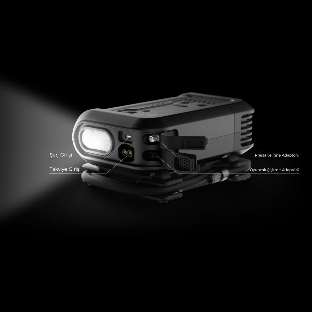 • Entegre 100 PSI / 6.90 BAR ayarlanabilir 280Watt güçlü lastik şişirme pompası ile Otomobil, motosiklet, 4x4, SUV araçlar, bisiklet lastikleri ve top gibi havası tamamen inmiş lastikleri dakikalar içinde şişirmenizi sağlar.