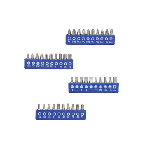 • 40 Adet = PH0 / 2xPH1 / 7xPH2 / 2xPH3 / H3 / H4 / H5 / H6 / PZ0 / PZ1 / PZ2 / PZ3 / SL3 / SL4 / SL5 / SL6 / SL7 / T10 / T15 / T20 / T25 / 2xS0 / 2xS1 / 4xS2 / 2xS3
