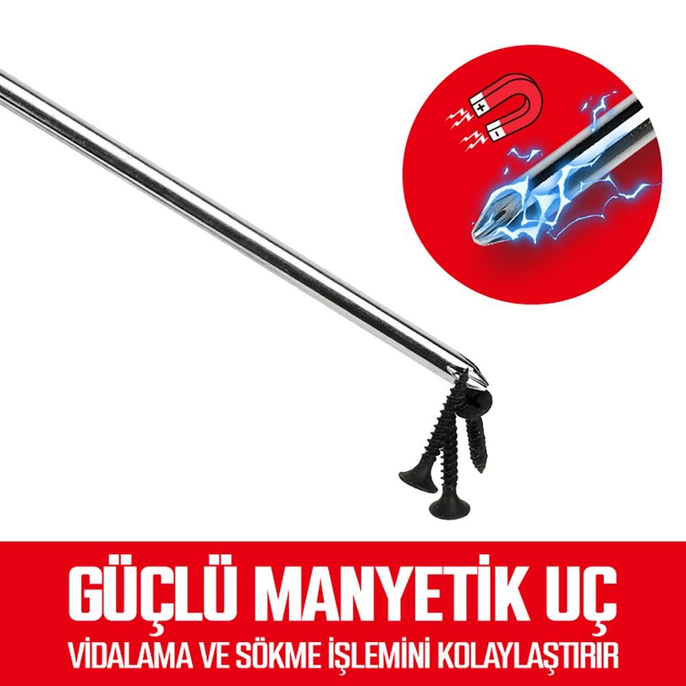 • Mekanik veya elektrikli aletlerin bakım ve onarımında, profesyonel olarak kullanılabilmesi için paslanmaya ve aşınmaya dayanıklı Manyetik Krom Vanadyum vidalama uçlarına sahiptir.