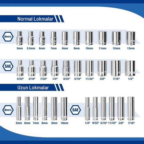 • 12 Adet = 1/4'’, 9/32’’, 5/16’’, 11/32’’, 3/8’’, 7/16’’ (1/4’’ İnç Uzun Lokma)