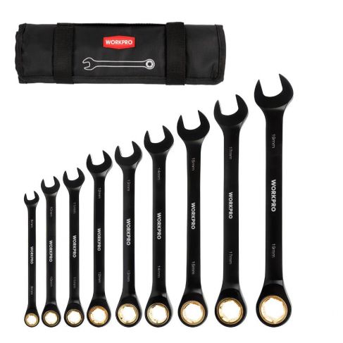 • WORKPRO WP202602 8-19mm 9 Parça CR-V Profesyonel Cırcır Kombine Anahtar Takımı + Bez Taşıma Kılıfı